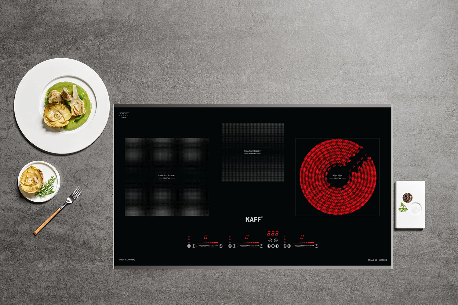 Bếp điện từ Kaff KF-IH6003IH sử dụng mặt kính Schott Ceran được làm từ chất liệu gốm thủy tinh có khả năng chịu lực va đập và sốc nhiệt tới 1000 độ C, chống xước tốt nên tuổi thọ cao. Mặt bếp tản nhiệt nhanh và được cách điện an toàn với các linh kiện điện tử bên trong thân. Mặt kính gồm các thấu kính hội tụ, truyền nhiệt từ bếp lên đáy nồi theo phương thẳng đứng, không thất thoát nhiệt ra môi trường. Mặt kính màu xám liền nguyên khối, an toàn, thẩm mỹ và tiện trong việc vệ sinh, lau chùi.