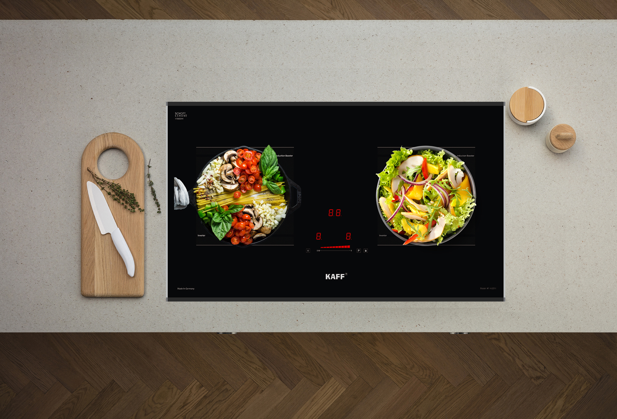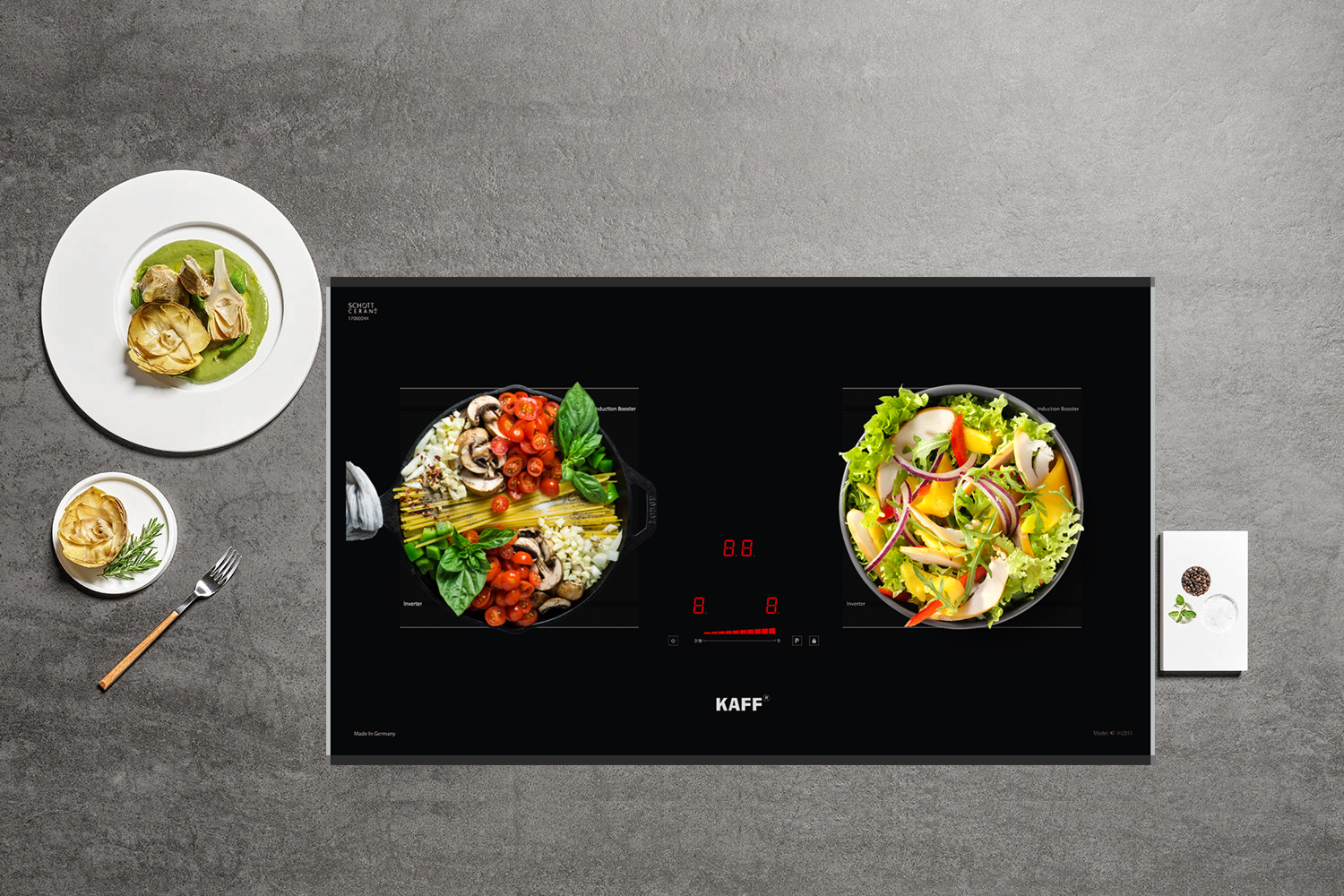 Bếp từ Kaff KF-IH201II sử dụng mặt kính Schott Ceran sản xuất tại Đức, mặt kính được làm từ chất liệu gốm thủy tinh có khả năng chịu nhiệt lên đến 1000°C, kháng sốc 750°C. Bề mặt kính chịu nóng lạnh cũng như sự thay đổi đột ngột của nhiệt độ. Độ giãn nở vì nhiệt thấp nên bếp hoạt động rất hiệu quả và cách nhiệt. Mặt bếp tản nhiệt nhanh và được cách điện an toàn với các linh kiện điện tử bên trong thân. Mặt kính màu xám liền nguyên khối, an toàn, thẩm mỹ và tiện trong việc vệ sinh, lau chùi.