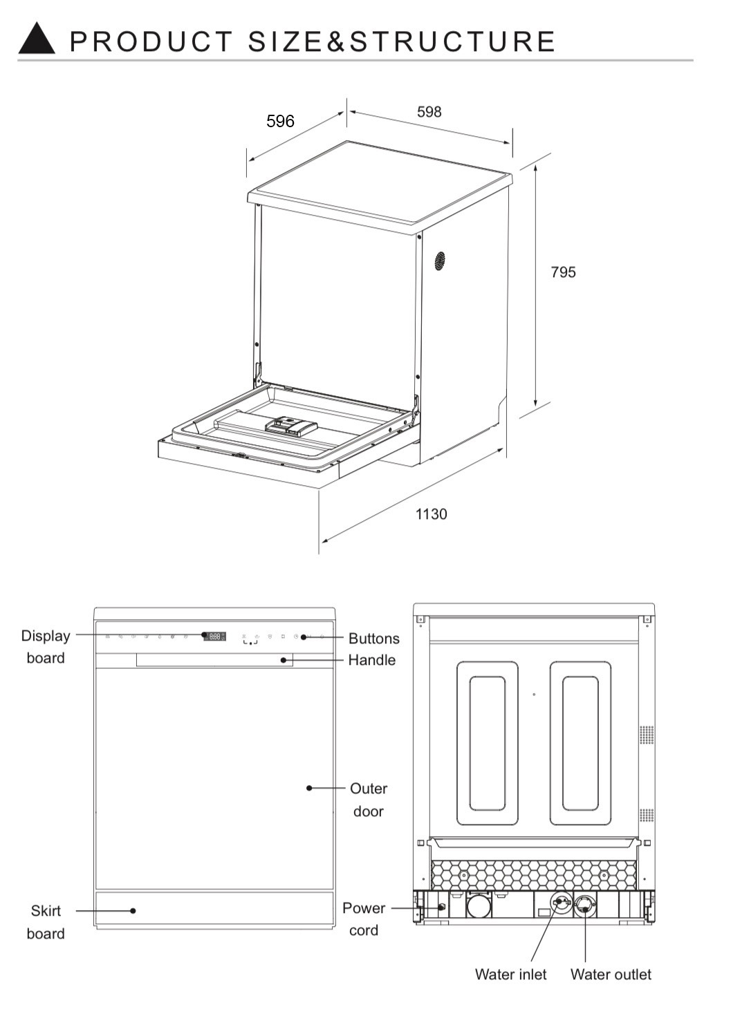 - Kích thước sản phẩm (Rộng x Sâu x Cao): 598 x 600 x 795 (mm).