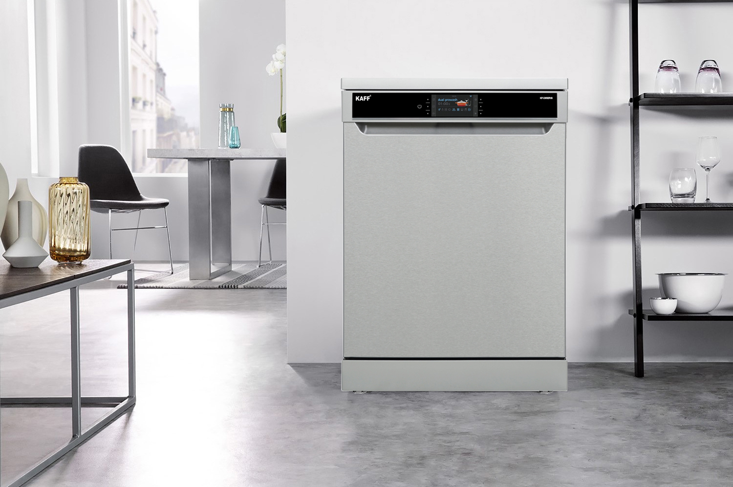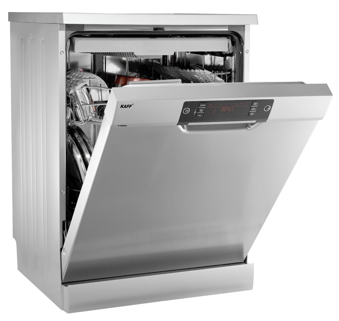 Máy rửa chén chính hãng Kaff có thiết kế hiện đại, chất liệu chủ yếu là inox chống gỉ giúp tăng độ bền và giữ vẻ ngoài sang trọng theo thời gian. Thương hiệu này có nhiều model với dung tích từ 8 bộ, 12 bộ đến 15–17 bộ châu Âu, phù hợp từ gia đình nhỏ đến gia đình đông người. Giỏ xếp của Kaff thường được thiết kế linh hoạt, có thể điều chỉnh độ cao để chứa xoong nồi lớn. Ví dụ, model Kaff KF-SW800 có khoang thép không gỉ và kết cấu khung chắc chắn, giúp tăng độ bền và hạn chế mùi trong quá trình sử dụng. Nhờ thiết kế tinh gọn và hoàn thiện tốt, các máy Kaff dễ dàng hòa hợp với nhiều phong cách bếp từ cổ điển đến hiện đại.