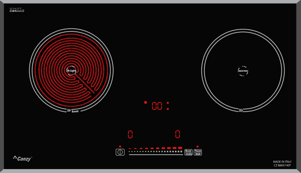 Bếp điện từ Canzy CZ BMIX740T gồm 2 vùng nấu. Vùng nấu phải với công suất là 2000W khi kích hoạt tính năng nấu siêu nhanh Booster công suất lên tới 3000W, vùng nấu hồng ngoại phải sử dụng mâm nhiệt E.G.O Hilight với mức công suất tối đa là 2200W. Chức năng Booster nấu siêu nhanh, tuy nhiên thời gian tối đa mặc định dùng chức năng này là 10 phút/lần tránh quá tải.