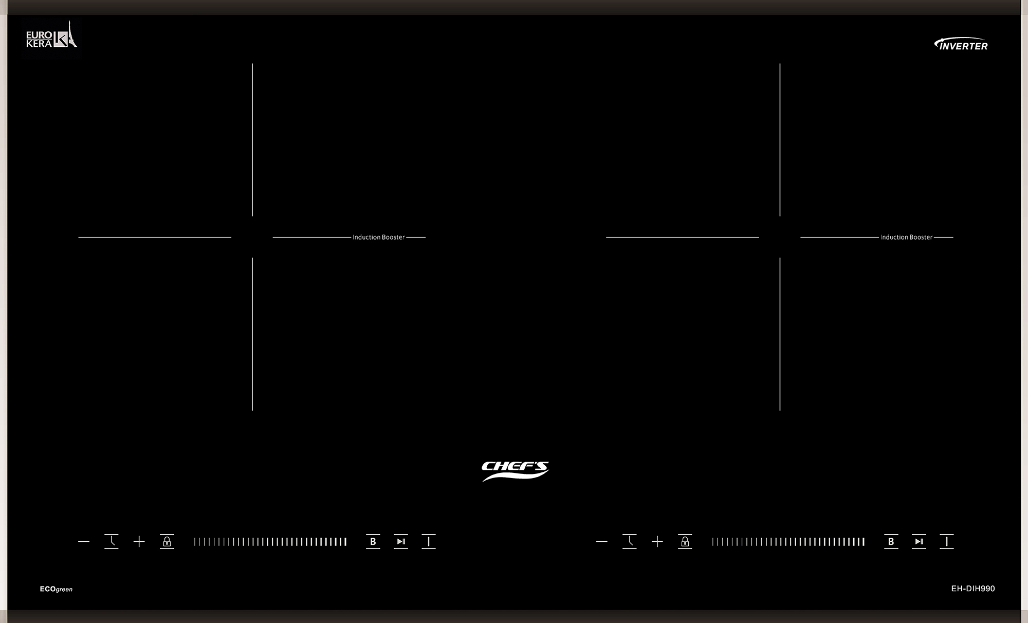 Bếp từ Chefs EH-DIH990 được tích hợp chức năng tự nhận diện vùng nấu, khi ta đặt nồi lên 1 trong 2 vùng nấu sau đó ấn nút khởi động bếp sau thời gian 1-2 giây bếp sẽ tự động tìm vùng nấu đã có nồi, ta chỉ việc điều chỉnh mức công suất to nhỏ theo ý muốn mà không phải thao tác chọn vùng nấu như bếp thông thường. Công nghệ Inverter được áp dụng trên bếp từ Chefs EH-DIH990 có khả năng phản ứng thay đổi công suất theo điều khiển ngay tức thì, khi người dùng điều chỉnh tăng giảm nhiệt độ đun nấu, bếp điều chỉnh thay đổi tức thì về mức nhiệt độ mong muốn.