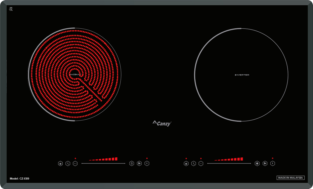Bếp điện từ Canzy CZ E89 gồm 2 vùng nấu. Vùng nấu trái với công suất là 2000W khi kích hoạt tính năng nấu siêu nhanh Booster công suất lên tới 2400W, vùng nấu hồng ngoại phải sử dụng mâm nhiệt E.G.O Hilight với mức công suất tối đa là 2200W. Chức năng Booster nấu siêu nhanh, tuy nhiên thời gian tối đa mặc định dùng chức năng này là 10 phút/lần tránh quá tải.