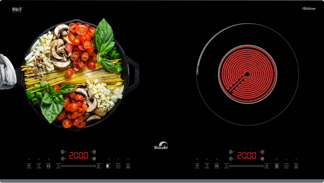 BẾP ĐIỆN TỪ BAUER BE 26MH PLUS thiết kế với 2 vùng nấu riêng biệt. Vùng nấu từ có công suất 2200W, khi sử dụng chức năng nấu nhanh Booster max 2400W. Bên vùng nấu hồng ngoại có công suất 2200W sử dụng hệ mâm nhiệt E.G.O HILIGHT hai vòng nhiệt. Điều chỉnh linh hoạt, tận dụng được mọi kích cỡ xoong nồi. Mâm nhiệt này có khả năng sinh nhiệt tập trung, nhiệt phân bố đều trong vùng nấu.