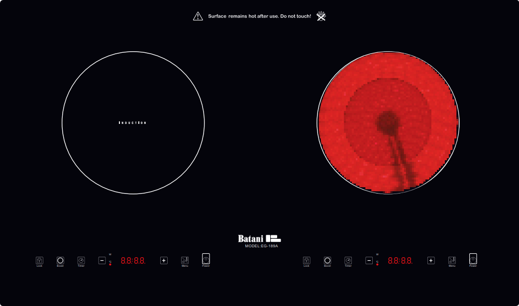 Bếp điện từ Batani EG-189A được tích hợp chức năng tự nhận diện vùng nấu, khi ta đặt nồi lên 1 trong 2 vùng nấu sau đó ấn nút khởi động bếp sau thời gian 1-2 giây bếp sẽ tự động tìm vùng nấu đã có nồi, ta chỉ việc điều chỉnh mức công suất to nhỏ theo ý muốn mà không phải thao tác chọn vùng nấu như bếp thông thường.