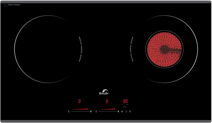 Bếp điện từ âm Bauer BE 22MH thiết kế với 2 vùng nấu riêng biệt. Vùng nấu từ có công suất 2200W, khi sử dụng chức năng nấu nhanh Booster max 2400W. Bên vùng nấu hồng ngoại có công suất 2200W sử dụng hệ mâm nhiệt E.G.O HILIGHT hai vòng nhiệt. Điều chỉnh linh hoạt, tận dụng được mọi kích cỡ xoong nồi. Mâm nhiệt này có khả năng sinh nhiệt tập trung, nhiệt phân bố đều trong vùng nấu.