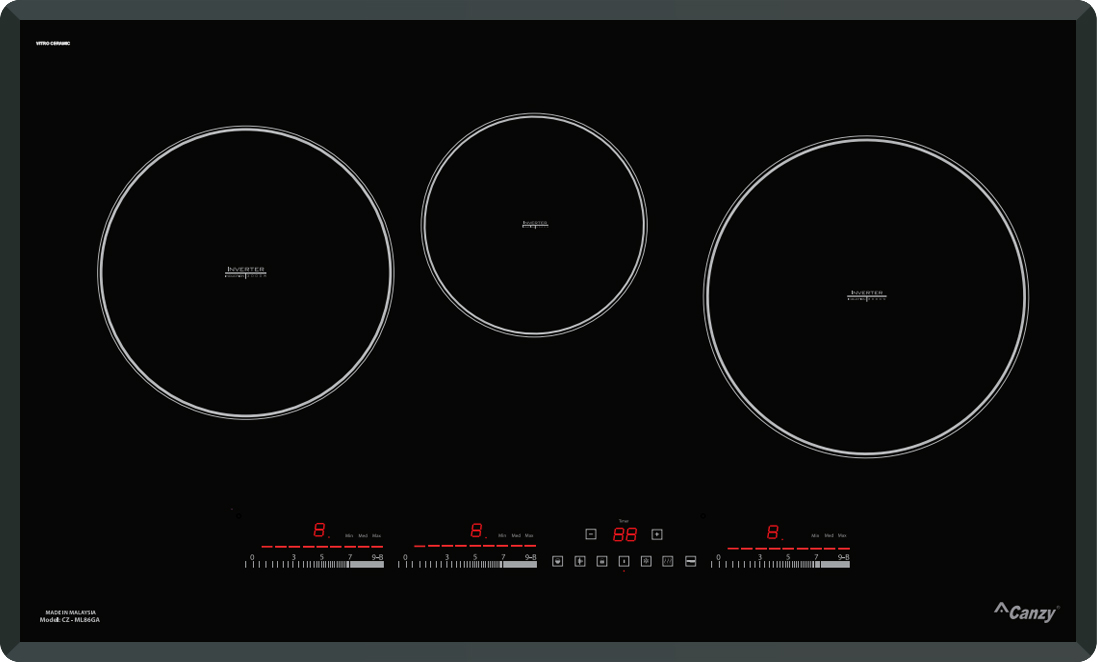 • Bếp ba: 3 vùng từ sử dụng mặt kính Vitro Ceramic vát 4 cạnh bo góc sang trọng