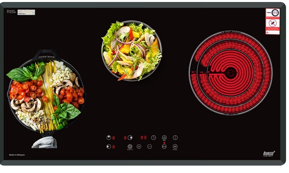 Bếp điện từ Lorca LCE – 307 gồm 3 vùng nấu từ siêu tốc với tổng công suất 5600W, với kích thước và công suất khác nhau, giúp bạn sử dụng được những nồi nấu to nhỏ khác nhau tùy vào từng món ăn và nhu cầu sử dụng. Vùng nấu hồng ngoại trang bị mâm nhiệt EGO HILGHT 03 vòng nhiệt tương ứng với công suất tối đa là 800W + 800W + 800W = 2400W, vùng nấu từ lớn có công suất tối đa là 2000W khi kích hoạt tính năng Booster công suất lên tới 2400W, vùng nấu từ nhỏ có công suất tối đa là 1200W khi kích hoạt tính năng Booster công suất lên tới 1800W. Chức năng Booster ở vùng từ nấu siêu nhanh, tuy nhiên thời gian tối đa mặc định dùng chức năng này là 10 phút/lần tránh quá tải.